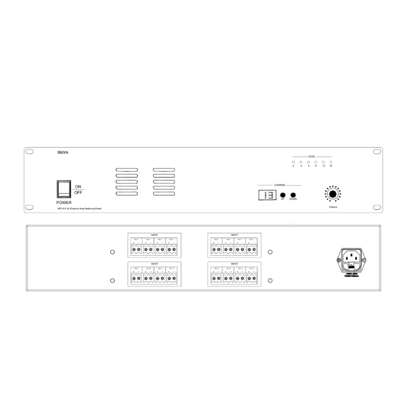 MP-416 is 16-Channel Amplifier Monitoring Panel provides streamlined monitoring of up to 16 power amplifier outputs in a single compact unit. Equipped with a digital keypad and a clear 2-digit LED channel display, it eliminates the limitations of traditional selector switches, offering faster and more intuitive channel selection.
